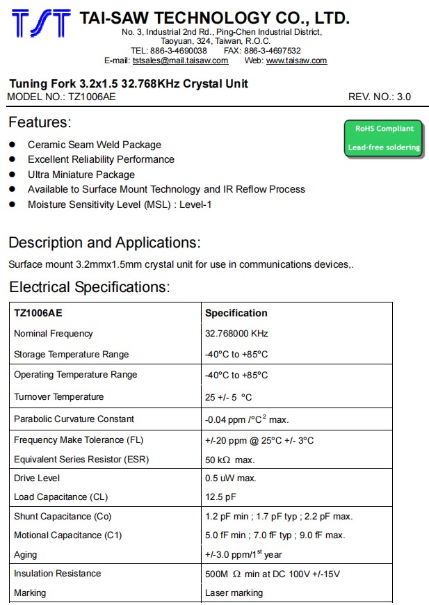 TST無源晶振TZ1006AE,32.768K石英晶體諧振器,3215貼片晶振,參數表