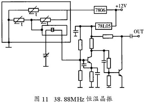 這是一種常規(guī)的恒溫晶體振蕩器。優(yōu)點是加熱相對簡單,能保證小尺寸情況下頻率一溫度穩(wěn)定性達(dá)最高;缺點是體積大、功耗高、預(yù)熱時間長機械費用高。圖11是一個簡單的恒溫晶振的電路它省去了熱控制放大器,PTC熱敏電阻既作溫度傳感器又作加熱元件。