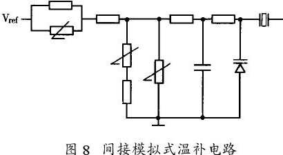 補償網絡輸出電壓直接驅動一變容二極管圖8是一具體電路,補償網絡與變容管間加了一級T型濾波器。這種補償有線性、3階、5階和7階數種,能夠在-40℃~+85℃寬溫范圍內獲得較好的補償,目前應用最為廣泛。有的地方已將它作成專用集成芯片。