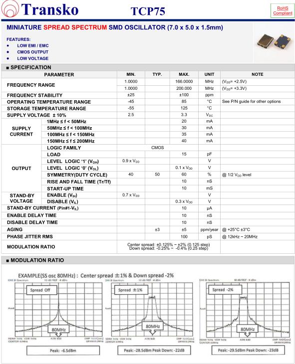 Transko晶振,TCP75晶振,TCP75-H50HM33SA-24.000M-TR晶振,小型SMD有源晶振,從最初超大體積到現(xiàn)在的7050mm,6035mm,5032mm,3225mm,2520mm體積,有著翻天覆地的改變,體積的變小也使產(chǎn)品帶來了更高的穩(wěn)定性能,接縫密封石英晶體振蕩器,精度高,覆蓋頻率范圍寬的特點(diǎn),SMD高速自動(dòng)安裝和高溫回流焊設(shè)計(jì),Optionable待機(jī)輸出三態(tài)輸出功能,電源電壓范圍:1.8V~5V,高穩(wěn)定性,低抖動(dòng),低功耗,主要應(yīng)用領(lǐng)域:無線通訊,高端智能手機(jī),平板筆記本W(wǎng)LAN,藍(lán)牙,數(shù)碼相機(jī),DSL和其他IT產(chǎn)品的晶振應(yīng)用,三態(tài)功能,PC和LCDM等高端數(shù)碼領(lǐng)域,符合RoHS/無鉛.