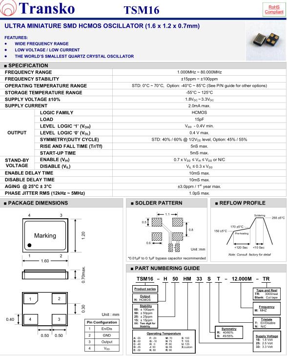 特蘭斯科晶振,TSM16晶振,TSM16-H50HM33ST-12.000M-TR晶振,小型SMD有源晶振,從最初超大體積到現(xiàn)在的7050mm,6035mm,5032mm,3225mm,2520mm體積,有著翻天覆地的改變,體積的變小也使產(chǎn)品帶來了更高的穩(wěn)定性能,接縫密封石英晶體振蕩器,精度高,覆蓋頻率范圍寬的特點(diǎn),SMD高速自動(dòng)安裝和高溫回流焊設(shè)計(jì),Optionable待機(jī)輸出三態(tài)輸出功能,電源電壓范圍:1.8V~5V,高穩(wěn)定性,低抖動(dòng),低功耗,主要應(yīng)用領(lǐng)域:無線通訊,高端智能手機(jī),平板筆記本W(wǎng)LAN,藍(lán)牙,數(shù)碼相機(jī),DSL和其他IT產(chǎn)品的晶振應(yīng)用,三態(tài)功能,PC和LCDM等高端數(shù)碼領(lǐng)域,符合RoHS/無鉛.