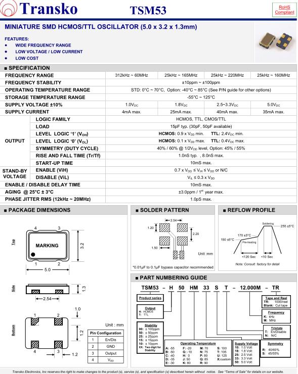 特蘭斯科晶振,TSM53晶振,TSM53-H50HM33ST-16.000M-TR晶振,5032mm體積的石英晶體振蕩器,有源晶振,該產品可驅動2.5V的溫補晶振,壓控晶振,VC-TCXO晶體振蕩器產品,電源電壓的低電耗型,編帶包裝方式,可對應自動高速貼片機自動焊接,及IR回流焊接(無鉛對應),為無鉛產品,超小型,質地輕.產品被廣泛應用到集成電路,程控交換系統,無線發射基站.