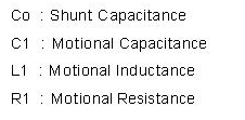 就是將石英晶體共振子轉換成振蕩頻率附近的Butterworth-Van Dyke (BVD)等效電路. 在這個圖中, 有四個主要參數 : 靜態電容-Co, 動態電容-C1, 動態電感-L1及動態電阻-R1.