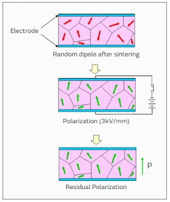 在經受燒制之后,鐵電陶瓷將立即產生具有隨機極軸的自發極化.總的來說,陶瓷似乎具有良好平衡的正負電荷.然而,通過施加高DC電壓,由自發極化產生的極軸在均勻方向上對準,即使去除電壓也不能取消.對準自發極化的極軸的過程稱為極化過程.