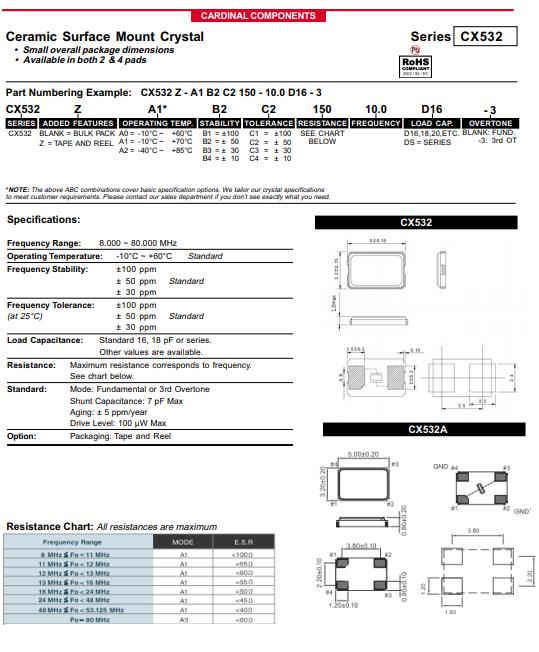 | CX532Z-A2B3C5-70-16.0D18 | Cardinal晶振 | CRYSTAL 16.0000MHZ 18PF SMD | CX532 | MHz Crystal | 16MHz | ±30ppm | 70 Ohm | -40°C ~ 85°C |
