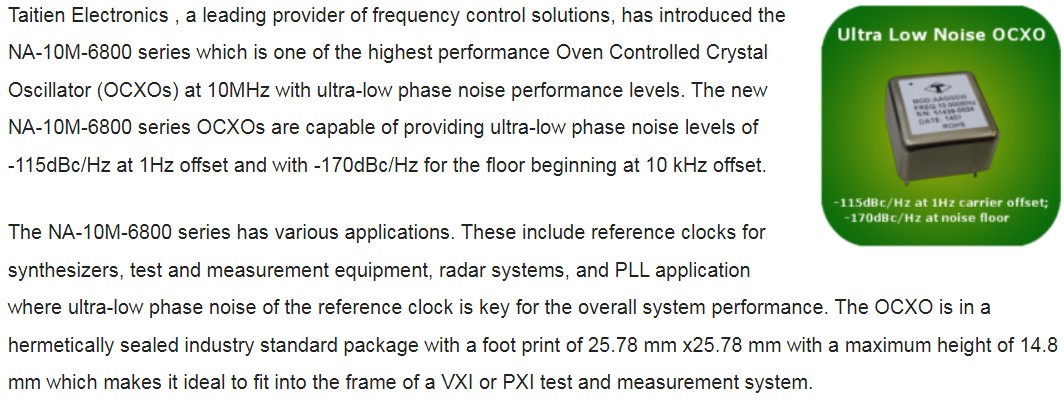頻率控制解決方案的領先供應商泰藝晶振推出了NA-10M-6800系列,它是性能最高的10MHz恒溫晶體振蕩器 (OCXO) 之一,具有超低相位噪聲性能水平。新的NA-10M-6800系列OCXO能夠在1Hz偏移處提供 -115dBc/Hz的超低相位噪聲水平,在 10kHz 偏移處開始提供 -170dBc/Hz 的本底噪聲水平。