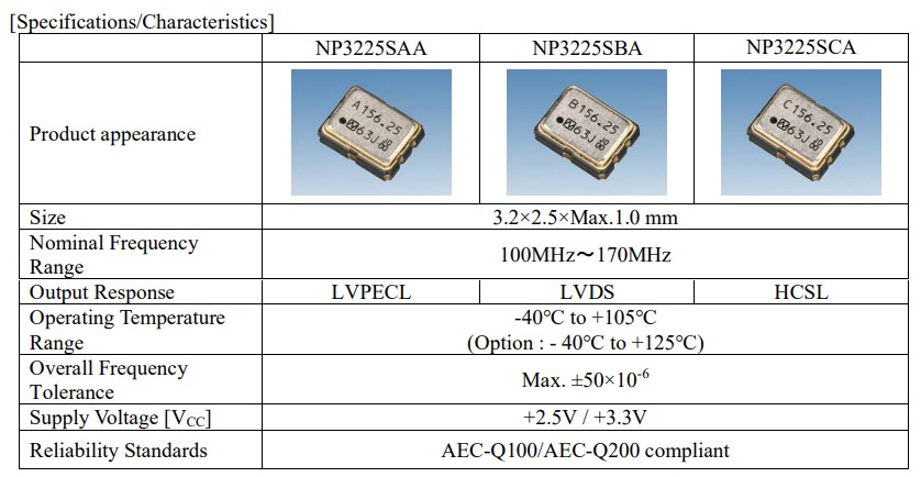 針對汽車安全應(yīng)用開發(fā)了業(yè)界首款NP3225SAA/NP3225SBA/NP3225SCA,小體積尺寸3.2x2.5mm,六腳貼片晶振,LVPECL差分晶振,有源晶振