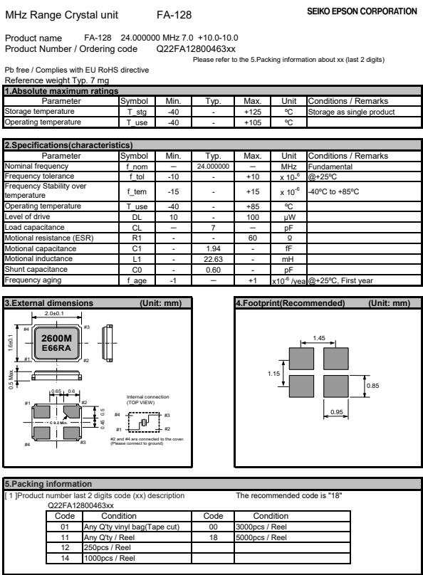 | Q22FA1280046300 | 2 x 1.6 x 0.5mm | FA-128 | 24.000000 MHz | 7 pF | +/-10 ppm |