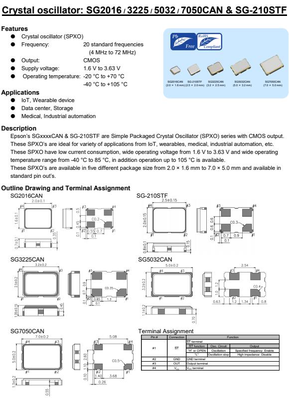 | X1G004801000200 | SG2016CAN | 24.000000 MHz | 2.00 x 1.60 x 0.70 mm | CMOS | 1.600 to 3.630 V | -40 to 85 °C | +/-50 ppm | 45 to 55 % |