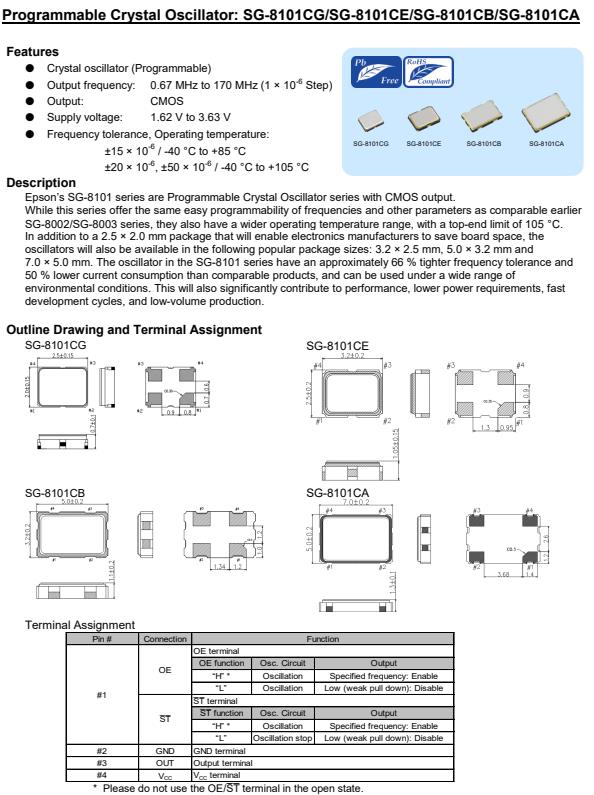 | X1G005191002100 | SG-8101CA | 18.000000 MHz | 7.00 x 5.00 x 1.40 mm | CMOS | 1.620 to 3.630 V | -40 to 85 °C |