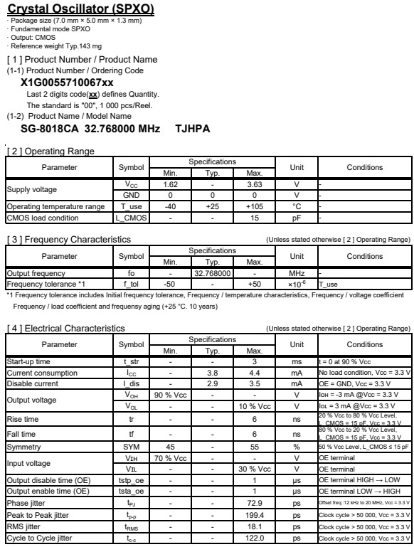| X1G005571006100 | SG-8018CA | 32.768000 MHz | 7.00 x 5.00 x 1.40 mm | CMOS | 1.620 to 3.630 V | -40 to 105 °C | +/-50 ppm |