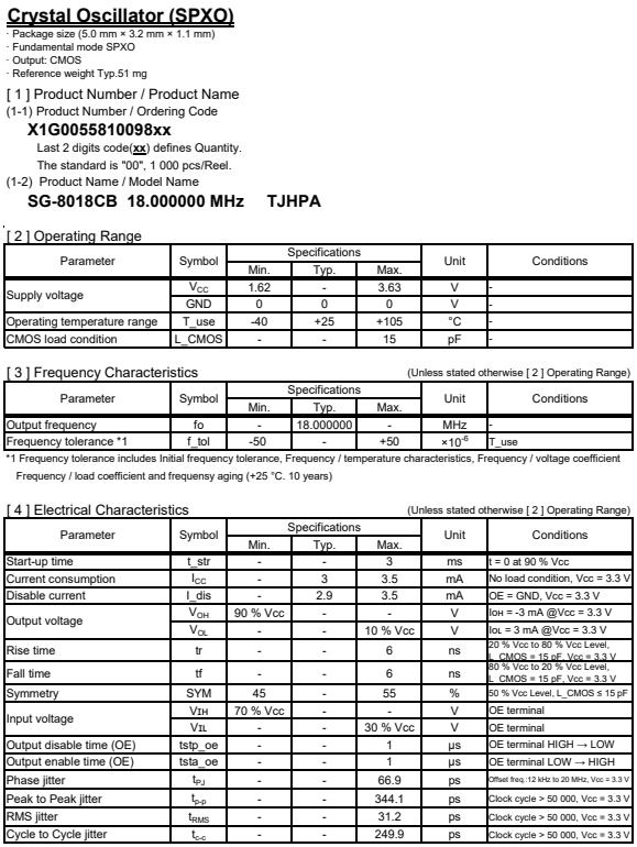 | X1G005581009800 | SG-8018CB | 18.000000 MHz | 5.00 x 3.20 x 1.30 mm | CMOS | 1.620 to 3.630 V | -40 to 105 °C | +/-50 ppm |