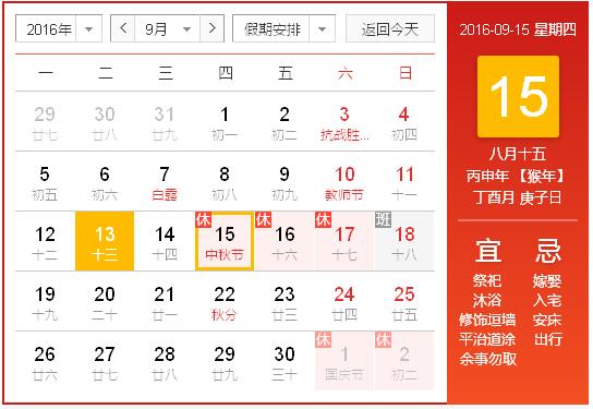 大家好!感謝大家長(zhǎng)期以來(lái)的辛勤勞作,根據(jù)《國(guó)務(wù)院辦公廳關(guān)于2016年部分節(jié)假日安排的通知》,結(jié)合公司實(shí)際情況,中秋節(jié)假期時(shí)間為9月15日至9月17日,共3天..18日(星期天)正常上班.