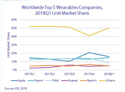 2018年第一季度,全球可穿戴設(shè)備的貨運總量,僅僅取得了1.2%的增長,數(shù)量為2510萬件。與一年前18%的同比增長相比,今年第一季度,該市場的增長已經(jīng)低出很多。其中,很大一部分原因,是基礎(chǔ)可穿戴設(shè)備的貨運總量出現(xiàn)了9.2%的下降。 在此同時,較高價格的可穿戴設(shè)備例如Apple、Fitbit以及知名時尚品牌的產(chǎn)品,出貨量在第一季增加了28.4%;這顯示消費者的偏好持續(xù)轉(zhuǎn)向更具智能性的設(shè)備。