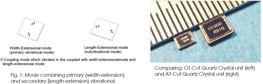 比較: GT切割石英晶體單元(左)和AT切割石英晶體單元(右)