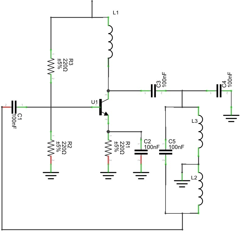 以下電路圖顯示了常見的Colpitts基本電路.電感器L和電容器C1和C2都與并聯諧振回路電路串聯,它給出振蕩器的頻率.C2端子上的電壓施加到晶體管的基極-發射極結,以產生反饋振蕩.