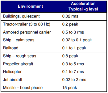 所有電子產品在其壽命期間都會受到沖擊和振動.力的范圍從口袋或背包中攜帶的移動消費品所經歷的運動到工業設備或航空航天應用的高振動水平.甚至建筑物中的固定產品也可能會受到附近風扇或其他設備的振動.因此,重要的是要考慮石英晶體振蕩器在沖擊和振動情況下的表現.表1顯示了各種環境下的典型加速度水平.