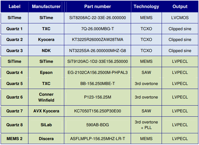表2測試中的振蕩器設備;單端部分(藍色陰影部分)工作在26兆赫,差分部分(綠色陰影部分)工作在156.25兆赫