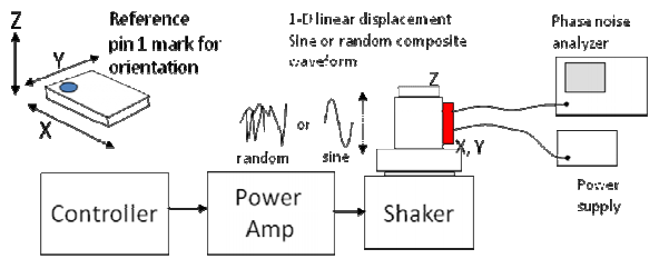 振動測試裝置由控制器,功率放大器和振蕩器組成,如圖1和2所示.每個正弦振動頻率(15,30,60,100,300,600,1000和2000赫茲)的峰值加速度為4克.振動頻率的每次掃描花費大約15到20分鐘,并且在每個頻率點的停留時間大約為1分鐘.振蕩器對外力的響應是各向異性的,即它取決于振動的方向.因此,參照封裝上的器件引腳1標記和圖1所示的方向,在x,y和z方向重復測試.這些圖顯示了每個振蕩器最壞情況下的數據.