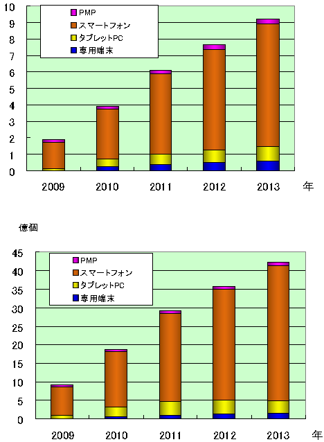 2009年的電子書籍臺(tái)數(shù)不到2億臺(tái),但2010年為不到4億臺(tái),約為2倍,預(yù)測(cè)2011年以后也會(huì)穩(wěn)定增長(zhǎng)的市場(chǎng).