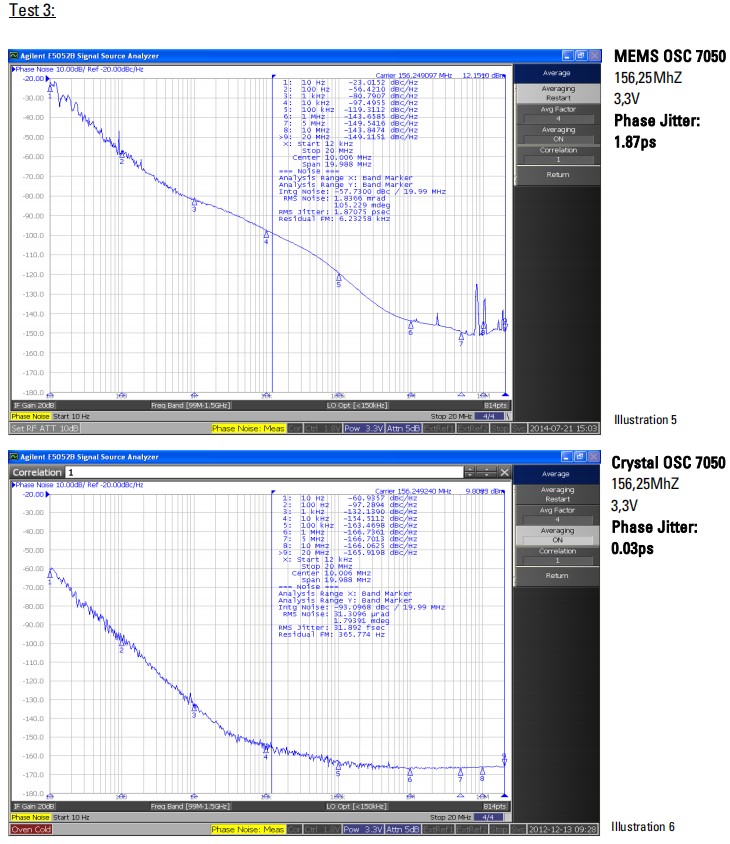 測試結果:三種被測試的晶體振蕩器都比三種MEMS振蕩器有更好的抖動