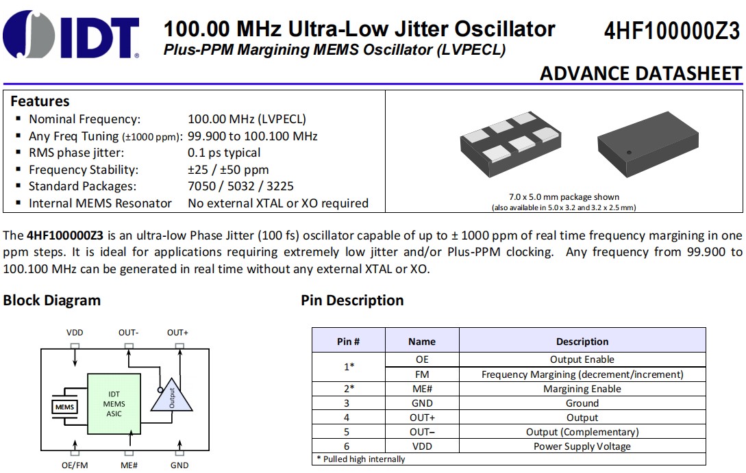 | 4HF100000Z3AACUGI | IDT晶振 | OSC MEMS 100.000MHZ LVPECL SMD | 4HF | 100MHz |