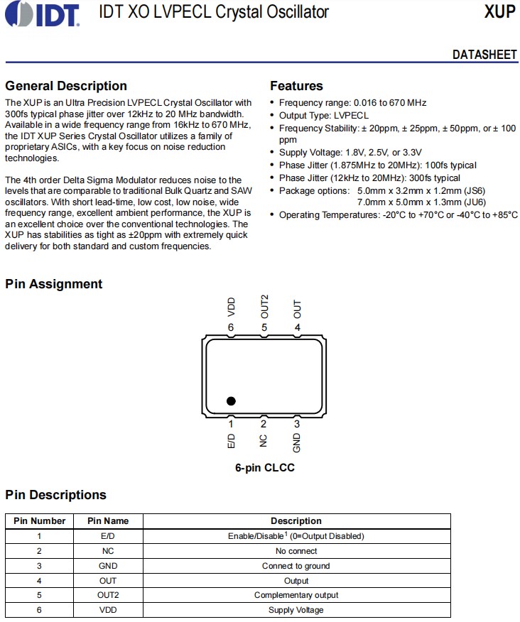| XUP535125.000JS6I | IDT晶振 | OSC 125MHZ SMD | XUP | 125MHz | LVPECL |