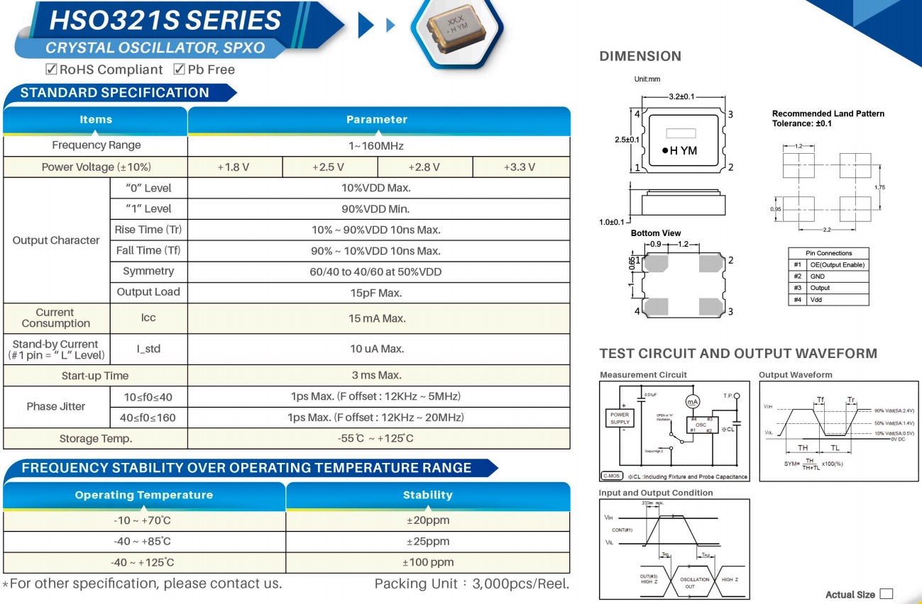 SSW010000I3CHE-T,HELE時鐘振蕩器,HSO321S石英晶振 參數(shù)表