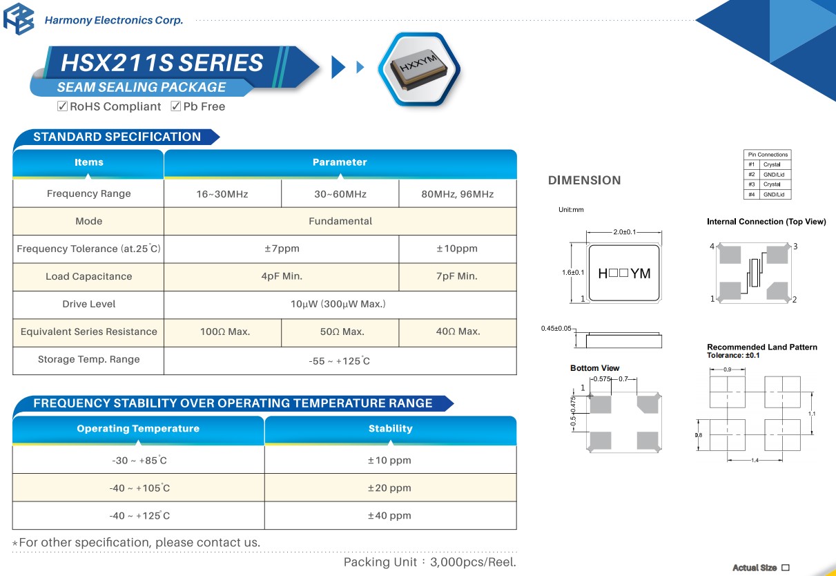 HELE加高小體積晶振,X2C016000B81H-R,HSX211S可穿戴設備晶振,2016mm石英晶振,數碼電子晶振,參數表
