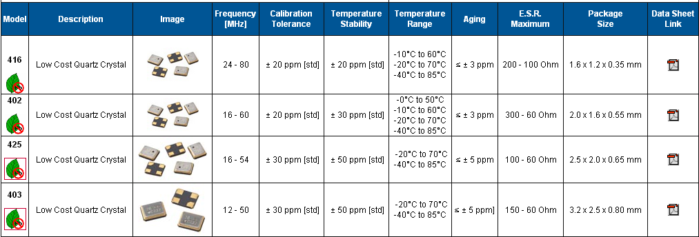 | 頻率公差@ 25°C | ±10ppm, ±15ppm, ±20 ppm, ±30 ppm, ±50 ppm | ||||