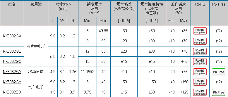 | 頻率公差 | Max. ±25 ×10-6 | Max. ±50 ×10-6 | Max. ±100 ×10-6 | |