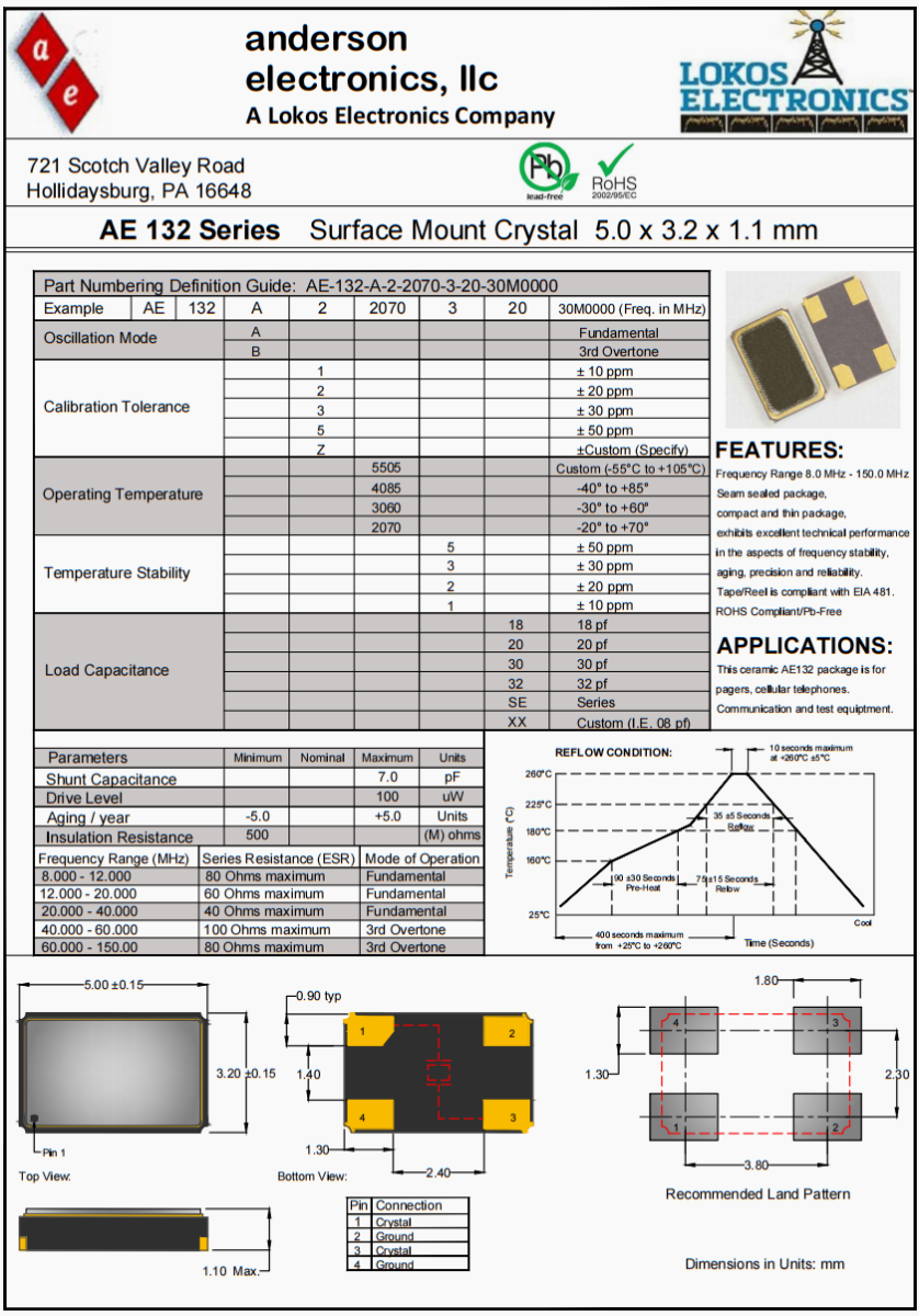 Anderson晶振公司研發的超可靠的AE132型號晶振,AE132型號石英晶體諧振器的特點:頻率范圍8.0 MHz - 150.0 MHz縫封封裝,封裝緊湊輕薄,在頻率穩定性、老化性、精度、可靠性等方面均表現出優異的技術性能。磁帶/卷軸符合EIA 481標準。通過無鉛認證/ Pb-Free