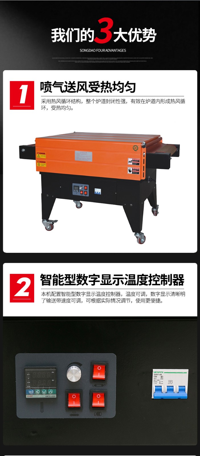 - 輸送速度可調:輸送速度可以根據包裝需求靈活調整。可以根據產品的大小、形狀復雜程度以及生產效率的要求來設置合適的輸送速度。比如,在包裝簡單的小型產品時,可以提高輸送速度,以提高包裝效率;而在包裝大型或形狀不規則的產品時,適當降低輸送速度,確保熱空氣有足夠的時間使薄膜充分收縮,從而保證包裝質量。