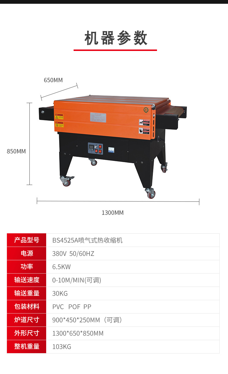- 收縮均勻度高:噴氣式熱收縮機通過噴氣系統將熱空氣均勻地噴射到包裝薄膜上。熱空氣能夠全方位地包裹產品,使得薄膜在各個方向受熱均勻。例如,在包裝正方體形狀的產品時,熱空氣會從產品的六個面同時作用,讓薄膜在各個面都能以相近的速度收縮,避免出現局部收縮過度或收縮不足的情況,從而使包裝后的產品外觀更加平整、美觀。