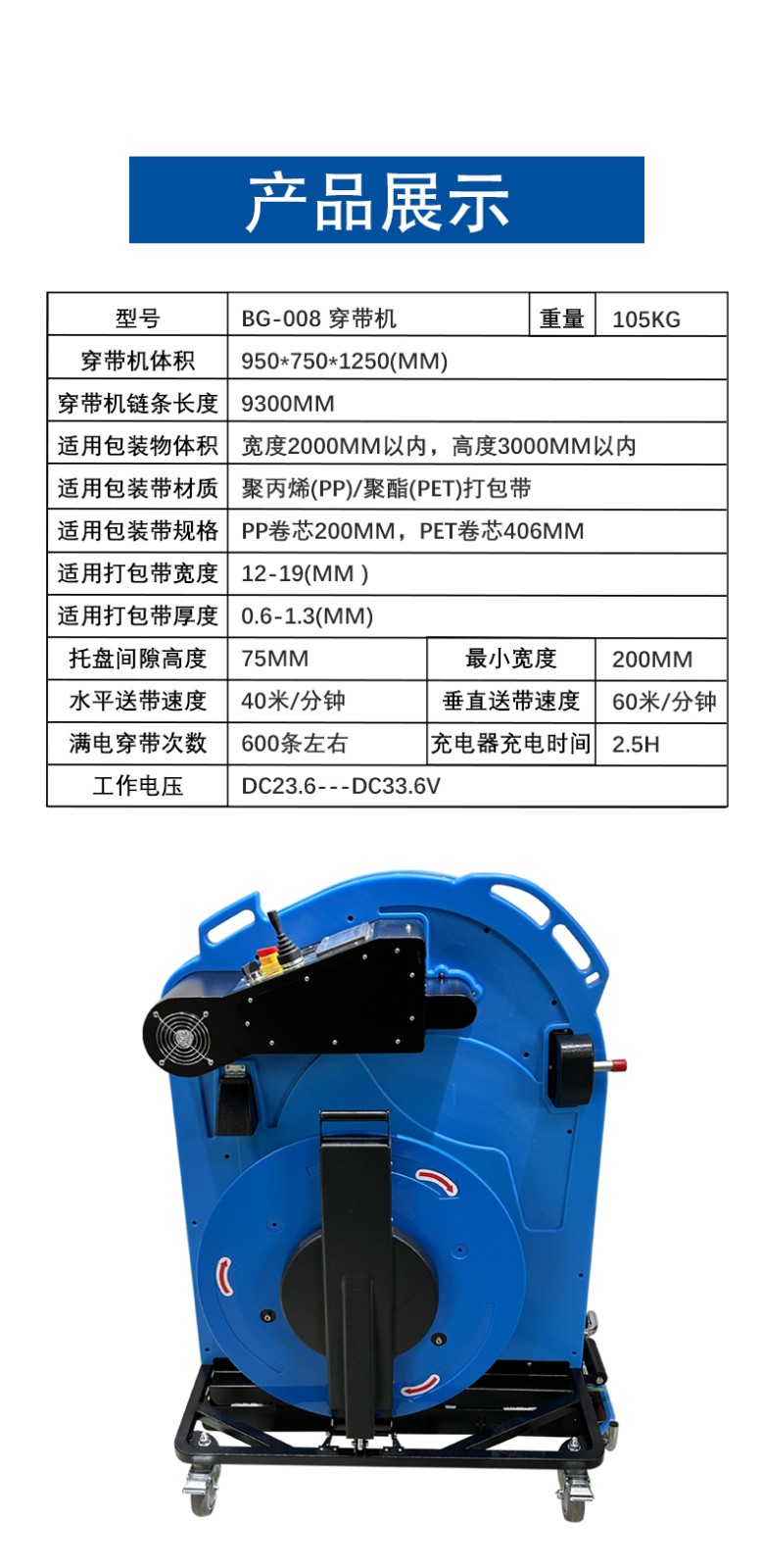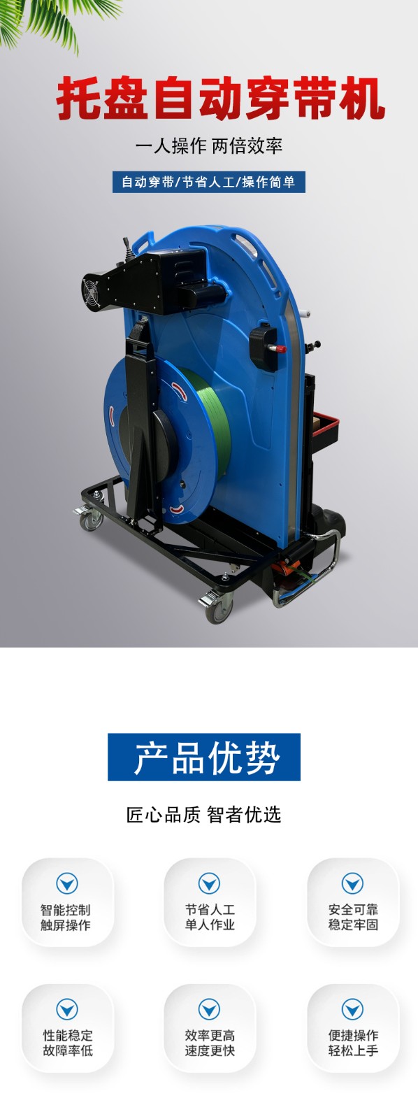 - 主要應用在需要高效、精準穿帶的場合。在大型自動化包裝生產線中,穿帶機與打包機等設備配合,確保包裝帶準確地穿過產品或包裝結構。