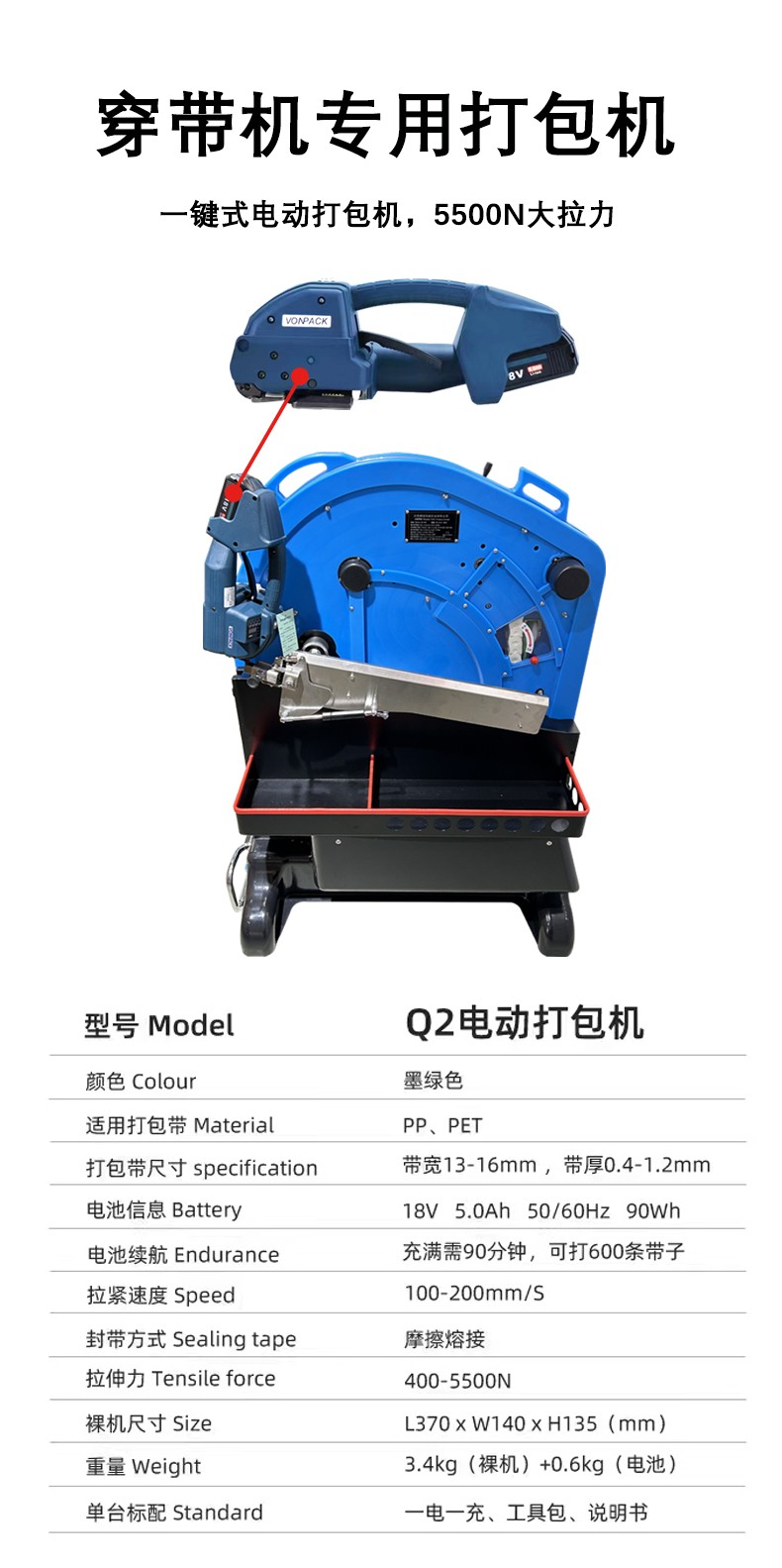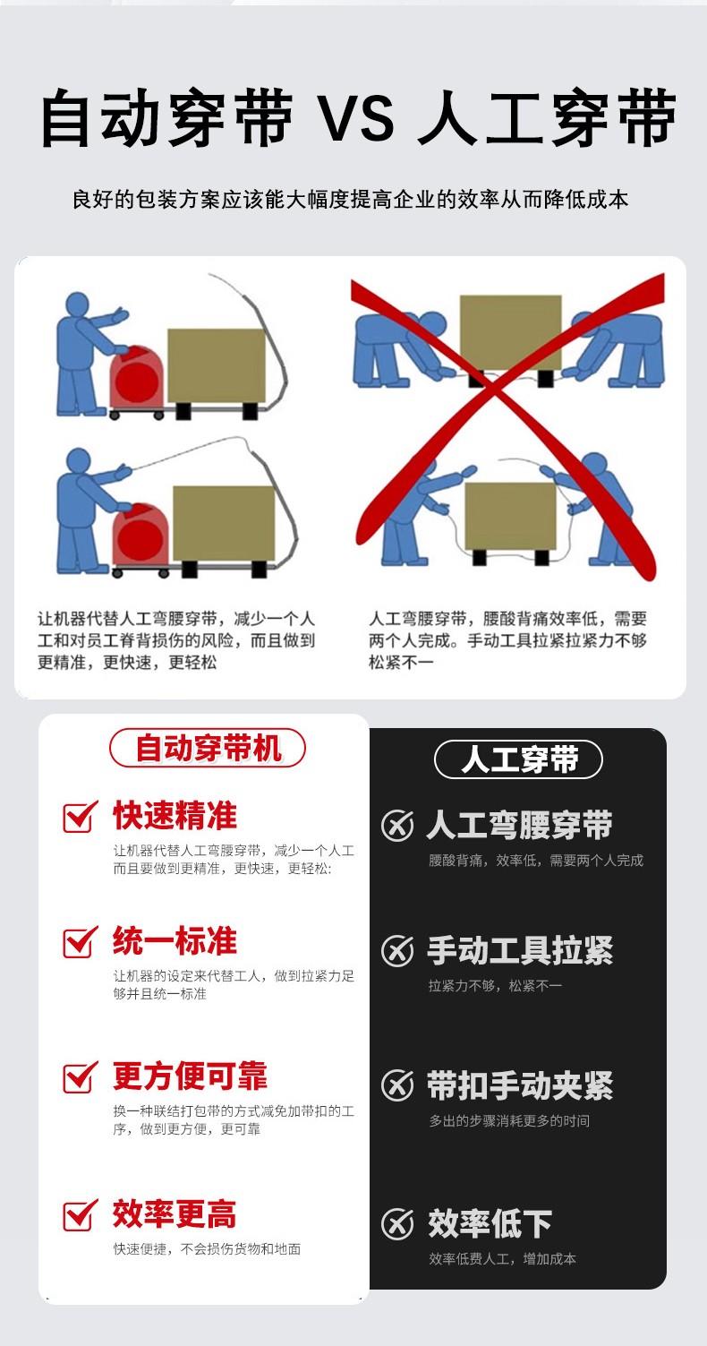 - 在包裝流程中主要起輔助作用。它是為打包機的工作做鋪墊,將打包帶準確地放置在合適的位置,方便打包機進行后續操作。如果把包裝過程比作一場接力賽,穿帶機就像是第一棒,為后續打包機的工作創造良好的條件。
