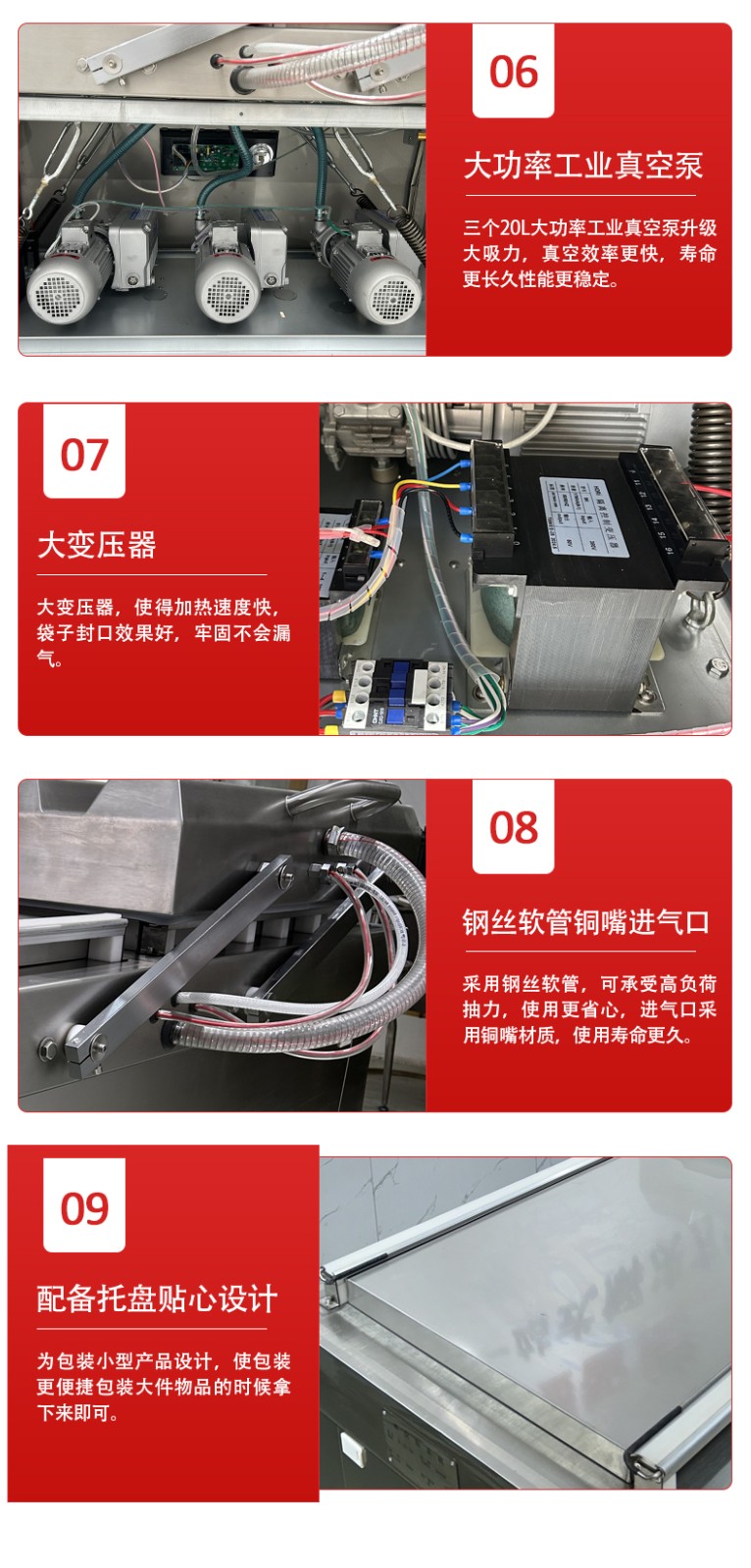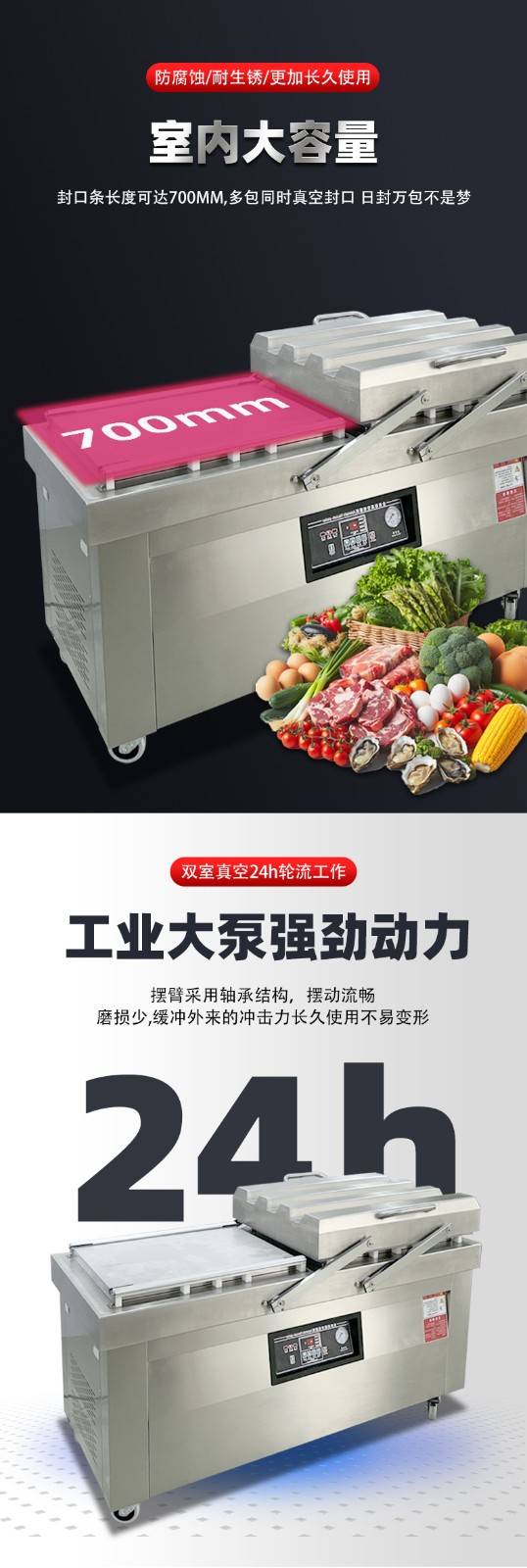 通過(guò)這種 “交替作業(yè)” 模式,雙室機(jī)無(wú)需等待單個(gè)室的完整流程結(jié)束即可開始下一批包裝,效率比單室機(jī)提升 60%-100%,同時(shí)雙泵 + 雙室獨(dú)立密封的設(shè)計(jì),也保障了每一批次物料的真空度與密封性穩(wěn)定。