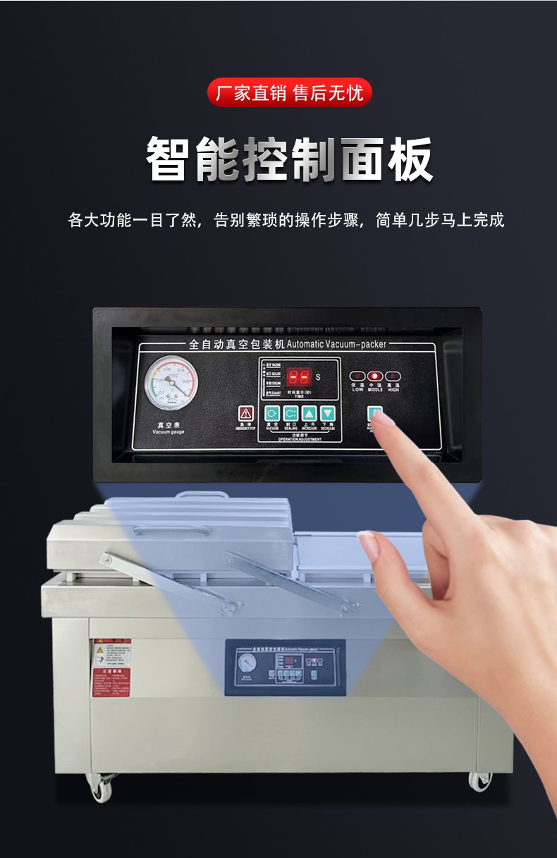 設(shè)備通電啟動(dòng)后,左、右兩個(gè)真空室均處于 “開蓋待機(jī)” 狀態(tài),真空泵、封口系統(tǒng)處于就緒狀態(tài)。操作人員首先將待包裝物料(如鹵味、電子零件)放入右室的包裝袋中,并將袋口平整鋪在真空室的 “封口條區(qū)域”(確保袋口無(wú)褶皺、無(wú)液體 / 雜質(zhì)污染),隨后按下右室 “啟動(dòng)” 鍵,右室蓋在氣動(dòng) / 電動(dòng)驅(qū)動(dòng)下自動(dòng)下壓,與真空室邊緣的硅膠密封圈貼合,完成右室初步密封。