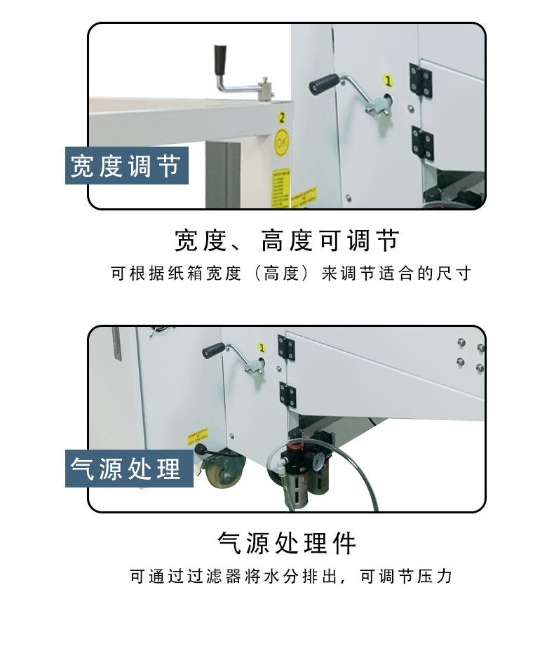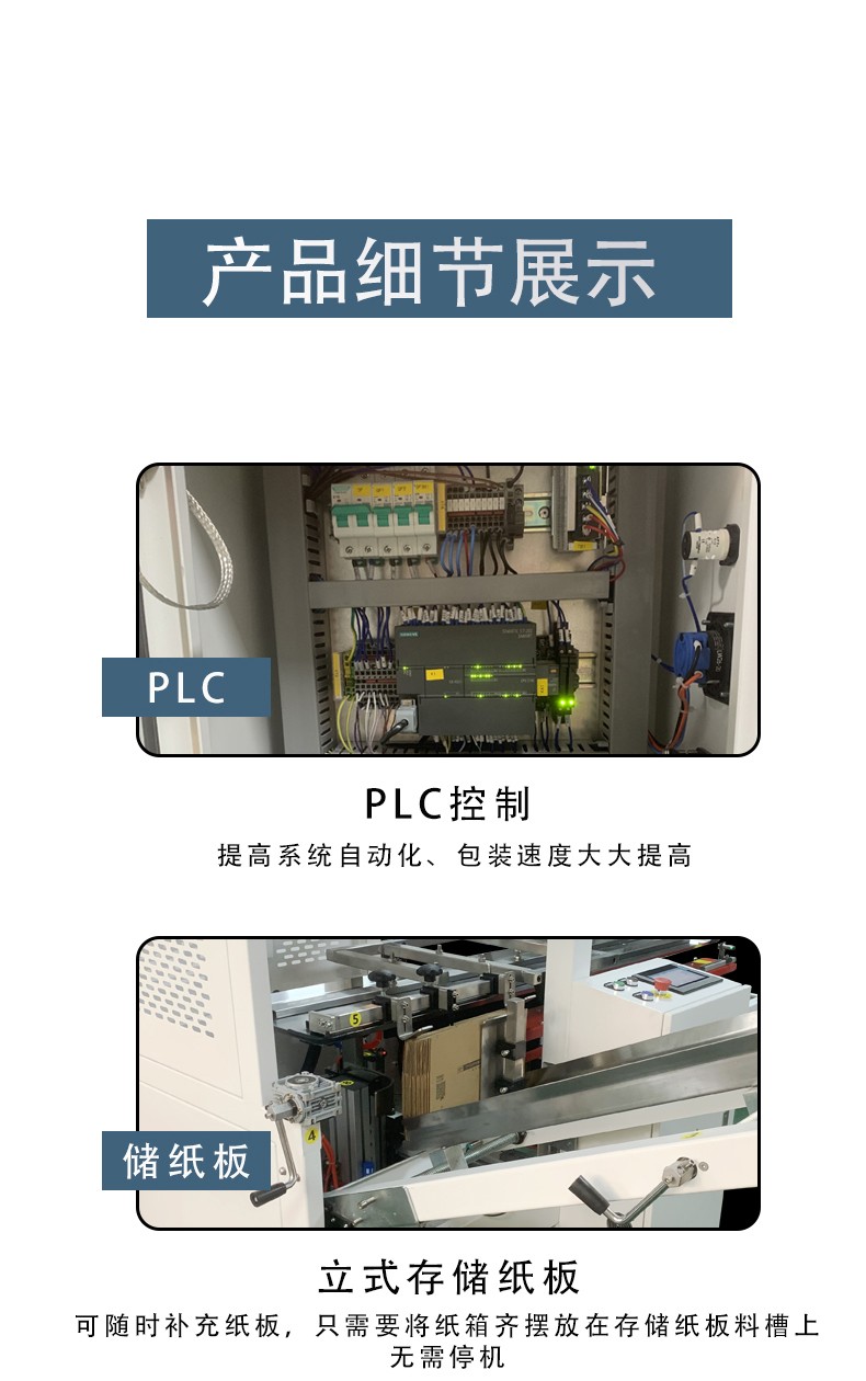 設(shè)備通過 PLC 程序精準(zhǔn)控制每一步動作(如吸箱力度、折邊角度、膠帶粘貼壓力),確保所有紙箱的