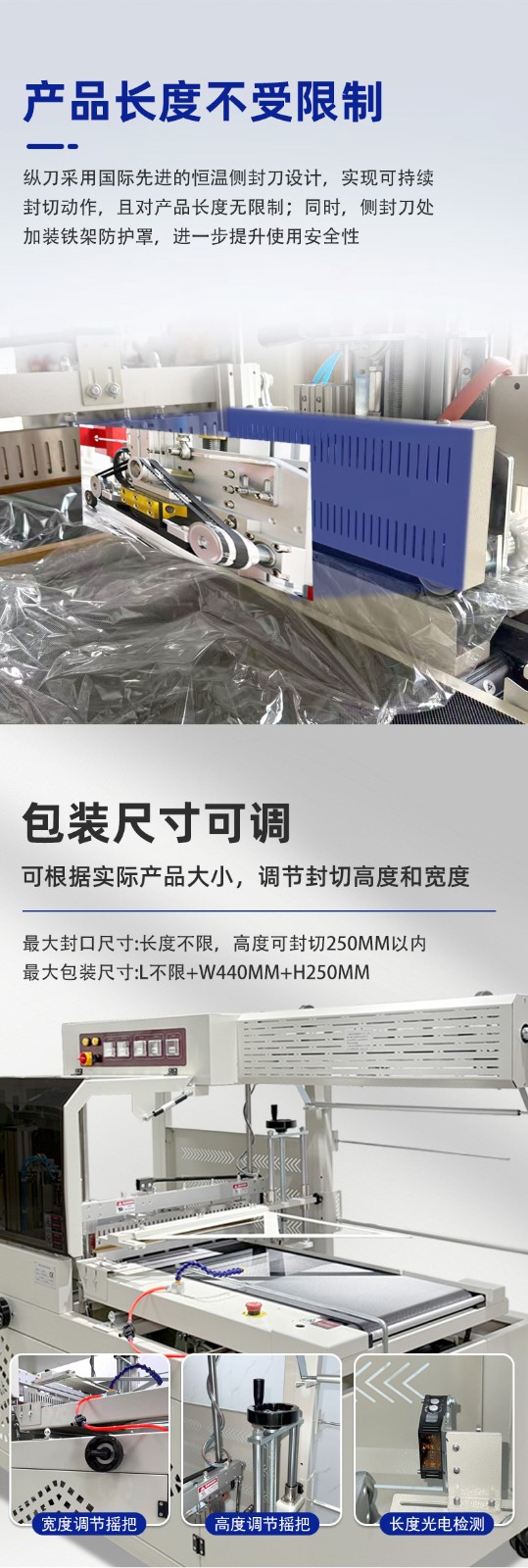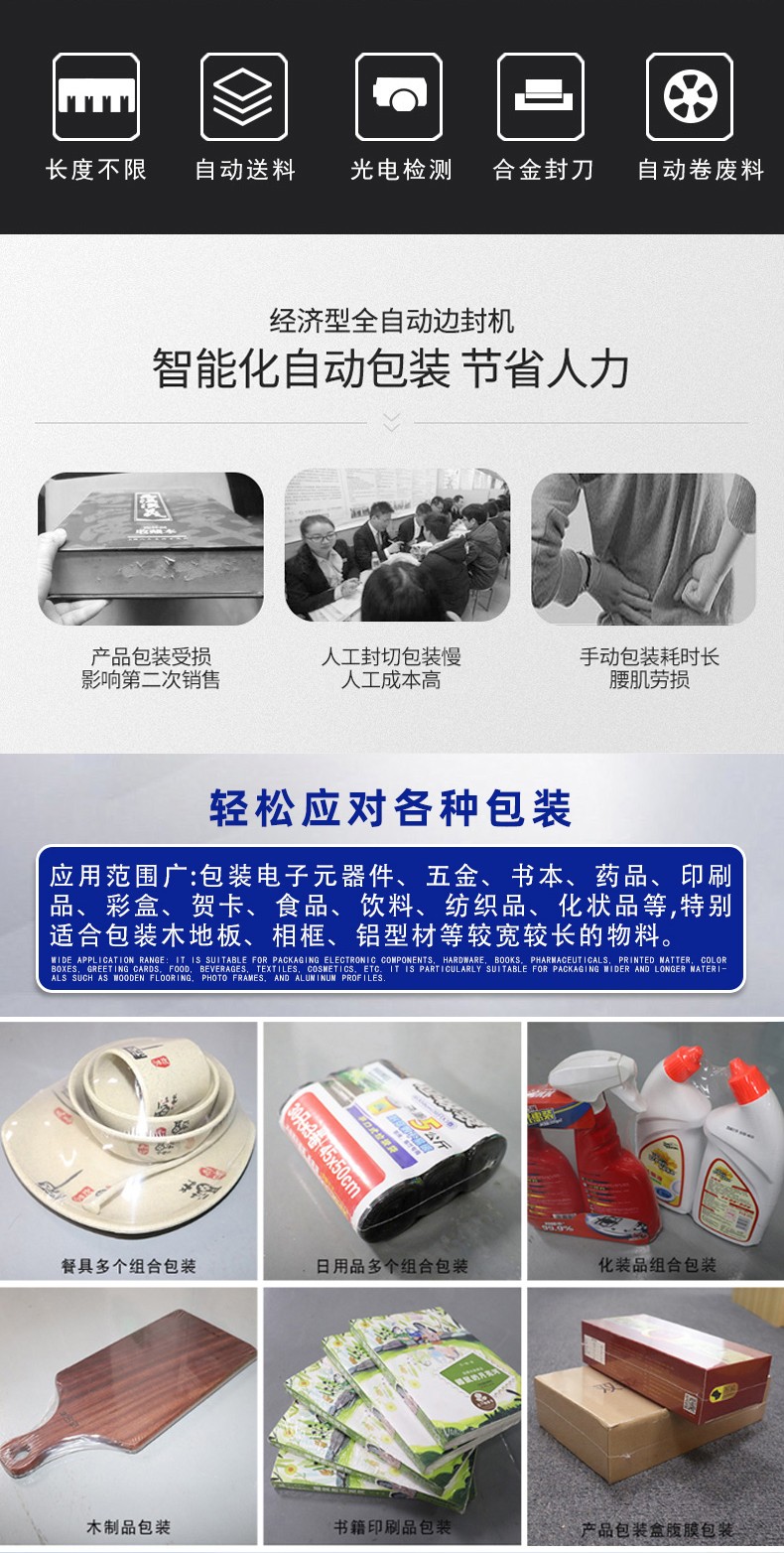 - 包裝長度無限制邊封機采用對折薄膜裹包產品的方式,形成環繞產品的薄膜 “套管”,僅對產品的側邊和尾部進行封切。其中尾部封切是隨著產品連續輸送,由橫封刀實時下落完成相鄰產品的分隔封口,無需受設備框架尺寸制約。再加上水平和垂直兩組光電傳感器自動偵測產品長度,不管是短至幾厘米的小物件,還是長至數米的鋁型材、木地板等,都能順暢完成包裝,不用更換適配不同長度的部件。