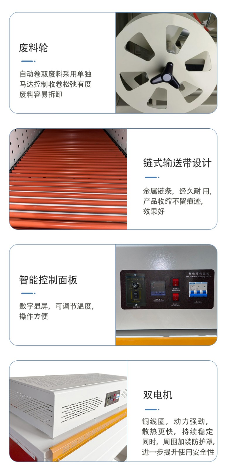 - 兼容多種包裝薄膜:其恒溫加熱封切系統可適配 PE、PVC、POF 等多種常用熱收縮膜。而且封刀多采用美國杜邦特弗龍防粘涂層,能應對不同薄膜的封切溫度需求,避免薄膜粘連刀具,保證封口牢固不焦化,像 POF 這種對封切精度要求高的環保薄膜,也能實現理想封切效果。