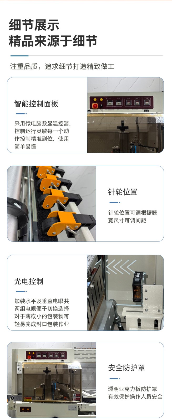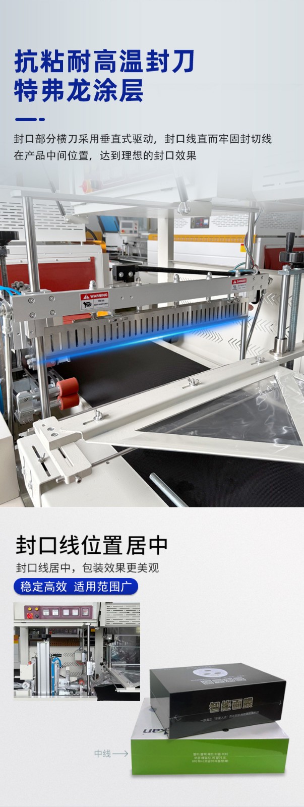 - 封口性能好:封切刀通常采用美國杜邦特弗龍防粘涂層,封口不會開裂、焦化,且帶有自動保護功能,可防止誤切包裝物。