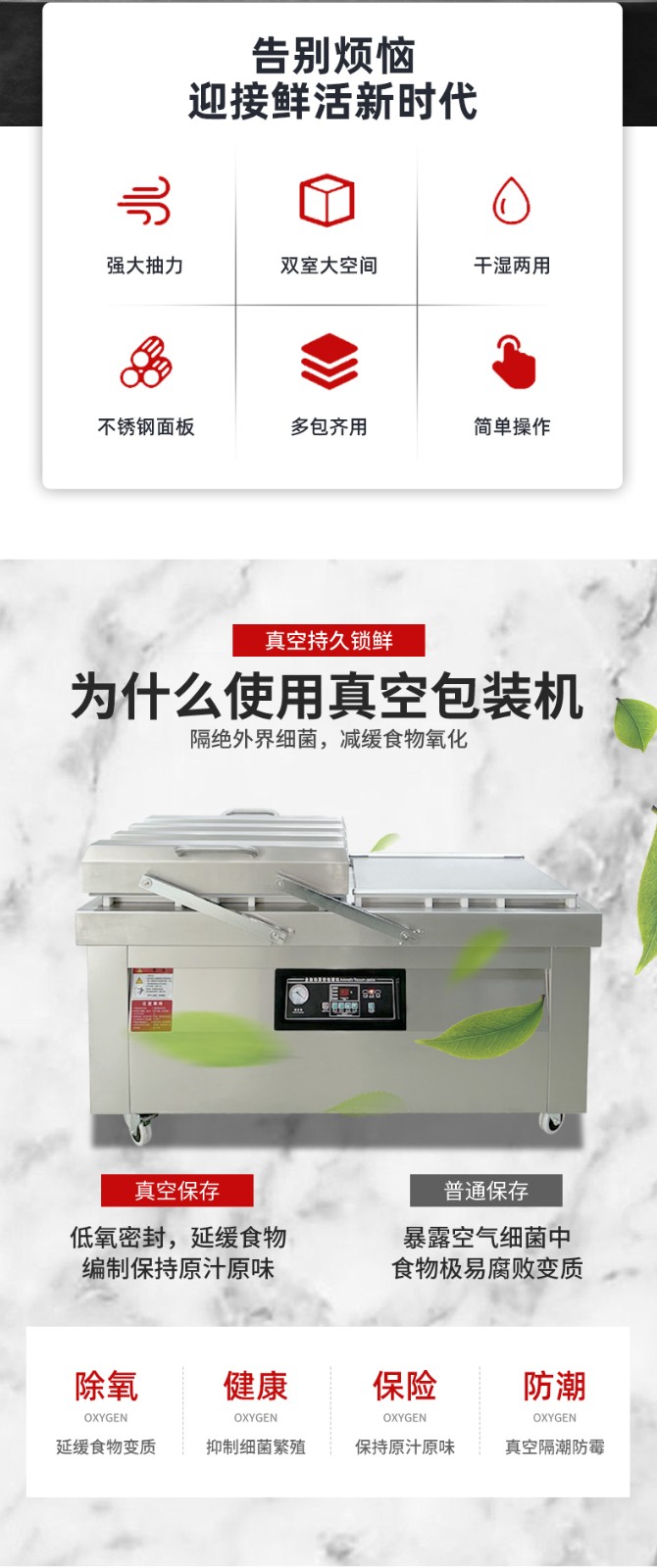 對于食品、醫藥等需要連續、穩定包裝的行業,雙室機的連續性優勢尤為突出,能避免因單室機的間斷性作業導致的產能瓶頸;而單室機更適合實驗室、小型門店、家庭作坊等小批量、間歇性包裝的場景。