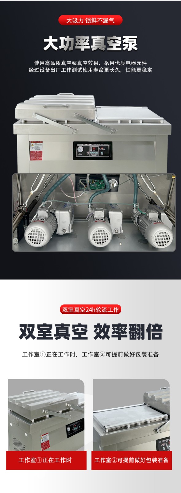 雙室機型的兩個真空室可實現 “一工一備”:當其中一個真空室正在進行抽真空、熱封作業時,操作人員可以在另一個真空室完成物料擺放、袋口整理的準備工作。