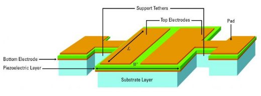 將電刺激施加到頂部電極之一激勵壓電層,其中橫向壓電系數e31在整個裝置中產生體聲波.然后諧振器橫向振動,并且機械運動通過壓電層轉換以由另一個頂部電極感測.器件的橫向長度L,組合諧振器本體EEFF的有效彈性常數和有效質量密度決定了基模的諧振頻率.