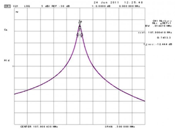 當體聲波在諧振器主體中沿不同方向分散時,通過設計諧振器的厚度和寬度以使來自其他方向的損失最小化,可以使所需長度方向上的能量最大化.例如,典型的107-MHz諧振器圖顯示測得的Q值為7453,IL為-12.4dB(圖2).
