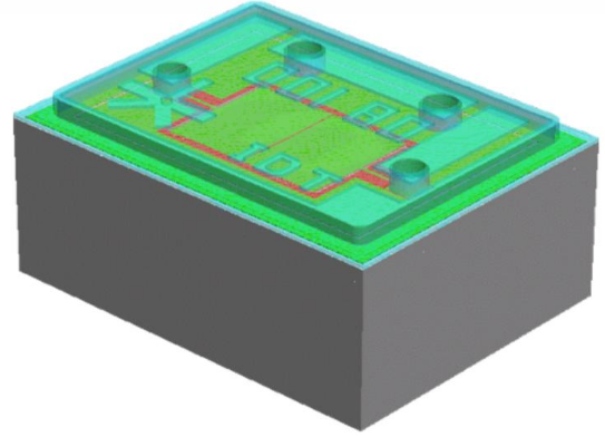 圖3示出了具有WLP的550×450×200mm3諧振器的3D視圖.為了正確看待事物,將切塊的WLPpMEMS諧振器放在一粒米上(圖4).最終,pMEMS諧振器被引線鍵合到IC管芯以形成振蕩器(圖5).
