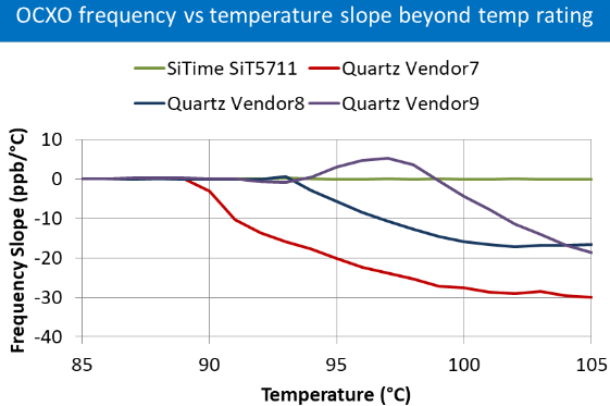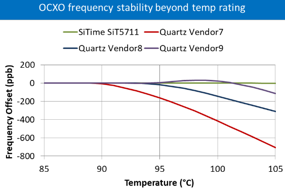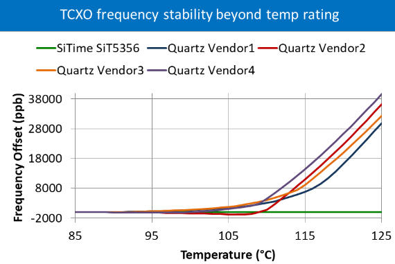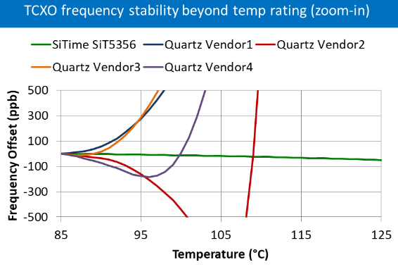 我們在測試OCXO晶振設(shè)備時(shí)會(huì)看到類似的行為,如下圖所示.在這里,我們比較了四個(gè)工業(yè)級(jí)OCXO器件的性能,從+85°C到+125°C.石英器件的穩(wěn)定性在溫度超過額定溫度范圍后開始降低,而基于MEMS的SiT5711EmeraldPlatform™OCXO可保持穩(wěn)定性.