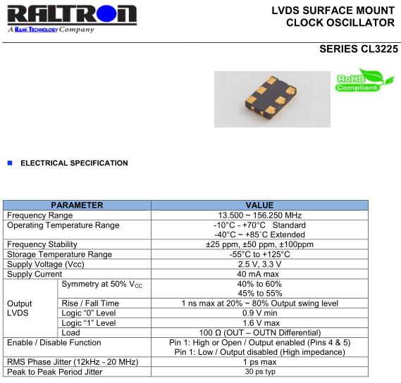 Raltron晶振,CL3225晶振,CL3225-155.520-2.5-25-X-T-TR晶振,小型SMD有源晶振,從最初超大體積到現在的7050mm,6035mm,5032mm,3225mm,2520mm體積,有著翻天覆地的改變,體積的變小也使產品帶來了更高的穩定性能,接縫密封石英晶體振蕩器,精度高,覆蓋頻率范圍寬的特點,SMD高速自動安裝和高溫回流焊設計,Optionable待機輸出三態輸出功能,電源電壓范圍:1.8V~5V,高穩定性,低抖動,低功耗,主要應用領域:無線通訊,高端智能手機,平板筆記本WLAN,藍牙,數碼相機,DSL和其他IT產品的晶振應用,三態功能,PC和LCDM等高端數碼領域,符合RoHS/無鉛.