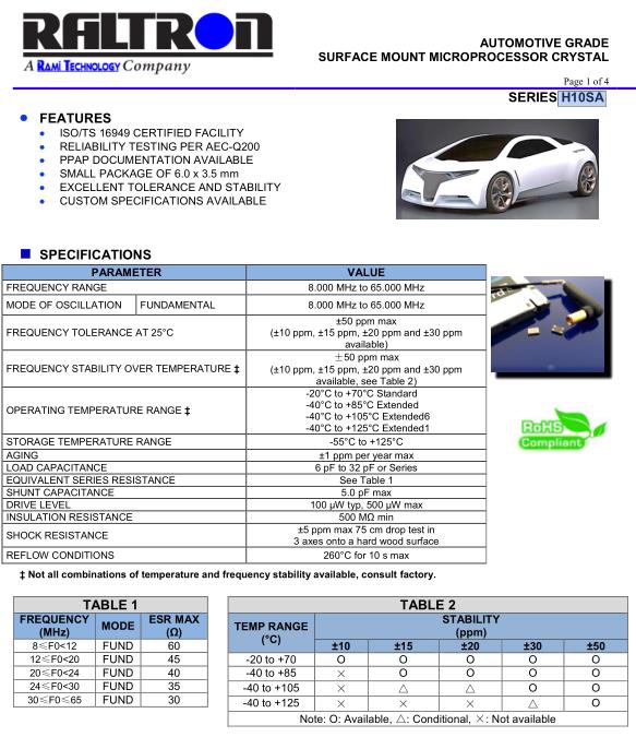 Raltron晶振公司是全球較受歡迎的石英晶振,有源晶振,壓電石英晶體等頻率產(chǎn)品制造商之一.Raltron晶振,H10SA晶振,H10SA-24.000-18-3050-EXT1-TR晶振.